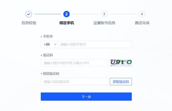 ① 手机号验证:输入绑定的手机号、图片验证码和短信验证码,点击【下一步】。