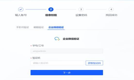 ② 企业微信验证:点击【获取验证码】按钮输入获取到的验证码,点击【下一步】