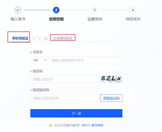 3. 选择验证方式手机号验证或者企业微信验证: